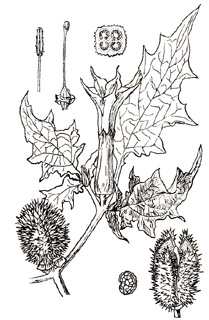 Datura stramonium (officinal) es una planta anual con hojas cortadas de color verde oscuro, flores solitarias, blancas a veces violáceas, grandes (5 a 10 cm). El fruto es una cápsula espinosa, como suele ocurrir en el género datura, que contiene muchas semillas pequeñas.